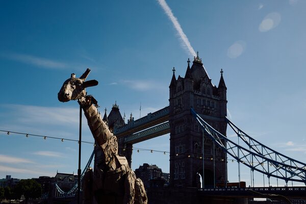 A life-size animal puppet, part of 'The Herds', is seen against Tower Bridge, during their journey from the Congo Basin to the Arctic Circle, in London on June 27, representing the effects of climate disaster.BENJAMIN CREMEL/AFP/Getty Images