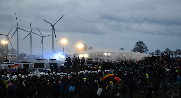 Police uses water cannons during a large-scale protest to stop the demolition of the village Luetzerath to make way for an open-air coal mine extension on January 14, 2023. In an operation launched earlier this week, hundreds of police have been working to remove activists, who have already occupied the hamlet of Luetzerath in western Germany.INA FASSBENDER/AFP/Getty Images