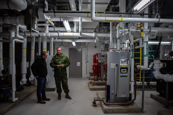 Jon Parker, left, speaks with Captain Peter Ryan in the control room of a solar-powered carbon-neutral building at CFB Gagetown in New Brunswick on November 29, 2022.Chris Donovan/The Globe and Mail