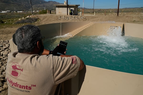 Glenn Chavez sets a timer as water fills a newly installed Heli-Hydrant, a small, open tank that helicopters can rely on to get water faster for urban fires. April 11, 2025, in Cabazon, Calif.Brittany Peterson/The Associated Press