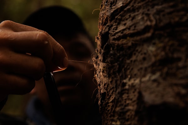 Marven Robinson, a Gitga'at Spirit bear guide, pulls a Spirit Bear hair from a rub tree, deep in the Great Bear Rainforest.Nasuna Stuart-Ulin/The Globe and Mail