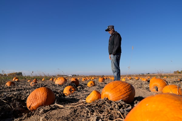 Some pumpkin farmers in the western United States, particularly wholesalers in places such as Colorado and New Mexico, are feeling the pinching effects of drought. Farmers have had to rely on dwindling water for irrigation while battling wacky weather to get their crops planted on time. Some have cut back on other crops they grow because pumpkins bring in the most money, while others have described lower yields of smaller gourds. Alan Mazzotti surveys one of his pumpkin fields on Oct. 26, 2023, in Hudson, Colo.Brittany Peterson/The Associated Press