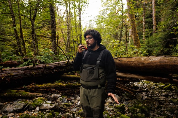 William Keating, 27, a Gitga'at spirit bear guide, radio's Marven Robinson for an update on whether bears were spotted further downriver.Nasuna Stuart-Ulin/The Globe and Mail