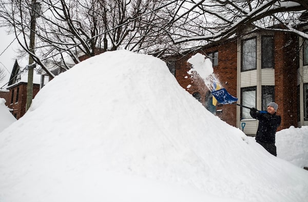 A resident shovels snow above their head onto a tall snow pile after a heavy overnight snowfall during a winter storm in Ottawa, Saturday, March 4, 2023.Justin Tang