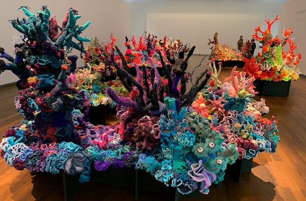To raise awareness for climate change two Australian sisters have created a colourful coral reef, albeit out of wool which is now the subject of a museum-wide retrospective at Museum Frieder Burda in Baden-Baden, Germany, January 28, 2022. Some 20,000 people from 50 cities have taken part in creating the crochet landscape to highlight the plight of global coral reefs.REUTERS TV/Reuters