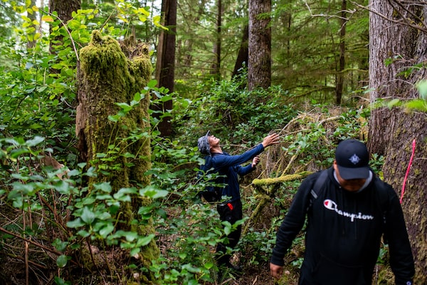 Johnny “Pompom” John, a Contract Ahousaht Guardian, gestures towards to the top of a large old growth tree.James MacDonald/The Globe and Mail