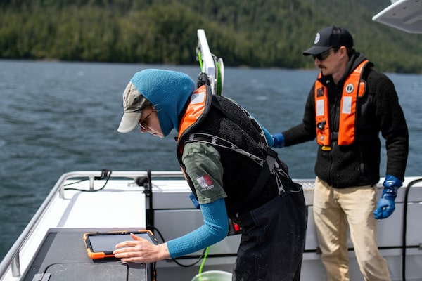 Gemma MacFarlane, the Ahousaht Guardian's Lead Biologist, looks over oceanographic data of a fjord in Ahousaht territory near Tofino.James MacDonald/The Globe and Mail