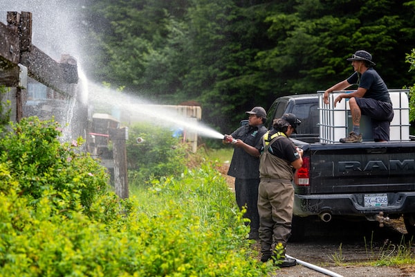 Ed Coon (with hose), Nathaniel Currie, and Tattuuskulth “Tatt” Charlie (in truck), all Tla-o-qui-aht Guardians, test wildfire fighting gear as the territory moves into fire season.James MacDonald/The Globe and Mail