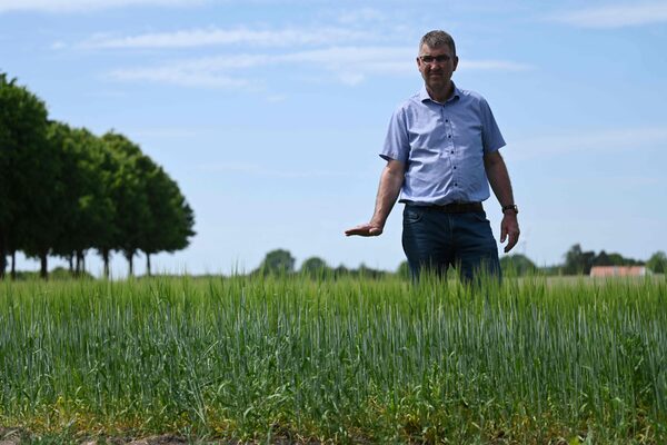 Farmer Lars Jonsson shows how high the barley should be at his farm outside the town of Lynge, Denmark, on June 15, 2023. Denmark experiences an extended period of dry weather with the warmest temperatures so far this year.SERGEI GAPON/AFP/Getty Images