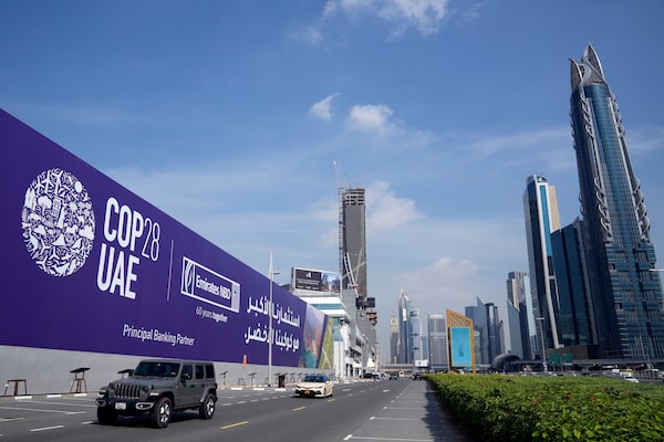 Cars pass by a billboard advertising COP28 at Sheikh Zayed highway in Dubai, United Arab Emirates, Monday, Nov. 27, 2023.Kamran Jebreili/The Associated Press