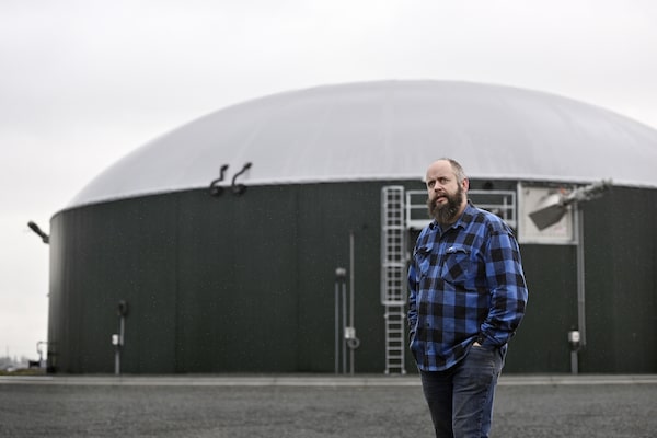 George Dick, owner and operator of Dicklands Biogas, stands in front of the digesters in Chilliwack, B.C., on Nov. 2, 2023.Jennifer Gauthier/The Globe and Mail