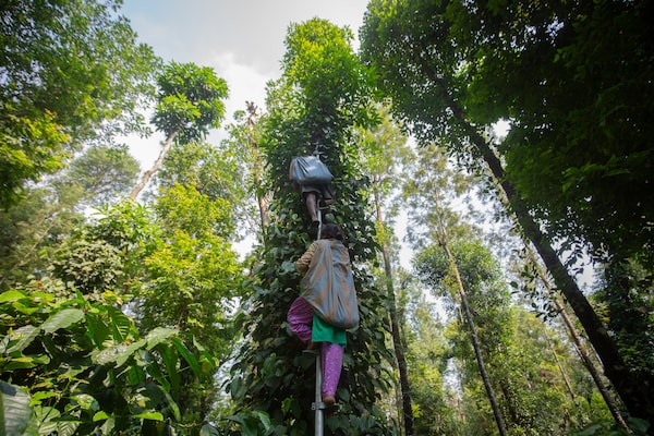 Plantation workers climb a ladder to harvest black pepper on April 12, 2025, in Somwarpet, in the southern state of Karnataka, India. The country's black pepper sector is bracing for a difficult year, with output falling to 46,000 metric tonnes from 55,000 metric tonnes in 2024, largely owing to unpredictable weather and the increasing impact of climate change.Abhishek Chinnappa/Getty Images