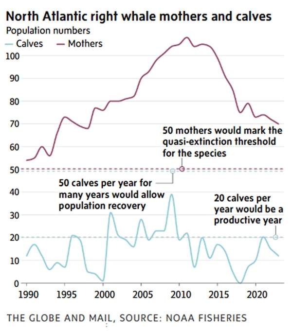 Since 2017, North Atlantic right whales have been caught in what the U.S. National Marine Fisheries Service of the National Oceanic and Atmospheric Administration calls an “Unusual Mortality Event.” More than 20 per cent of the population is sick, injured or has been killed. Plus, stressors such as entanglements, vessel strikes, declining prey and ocean noise have disrupted their birthing cycle.