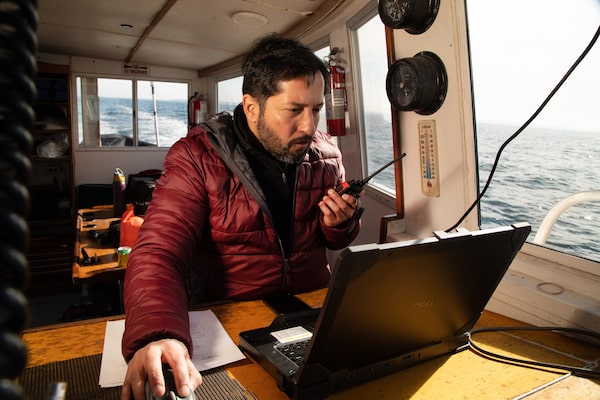 Daniel Palacios, senior scientist and director with the Center for Coastal Studies, monitors the computer and talks to the crew up while looking for North Atlantic right whales in Massachusetts's Cape Cod Bay on March 25, 2025.LAUREN OWENS LAMBERT/The Globe and Mail