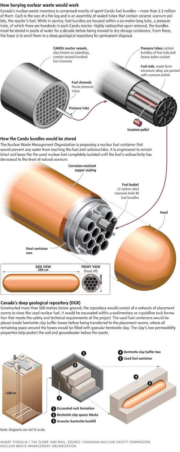 Canada’s nuclear authorities believe that they have the answer: They will isolate the used reactor fuel in a “deep geological repository,” or DGR. Specialists would bore down about 700 metres to reach stable rock formations, creating a shaft deeper than the CN Tower is tall.