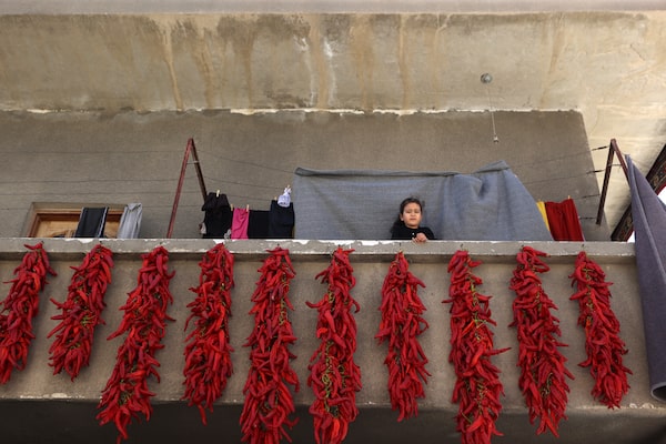 A girl looks down from a balcony where red pepper ristras are hung to dry in Salqin village in Syria's rebel-held Idlib province, near the border with Turkey, on September 14, 2024. During harvest season, Salqin, alongside other towns of Syria's northwestern rebel-held Idlib region traditionally growing this crop, is colored red as farmers process the peppers, drying them on balconies and rooftops to produce flakes, paste, and powder, to be sold in local or external markets, a livelihood which has become threatened in recent years due to its increasing costs amid climate change and conflict.AAREF WATAD/AFP/Getty Images
