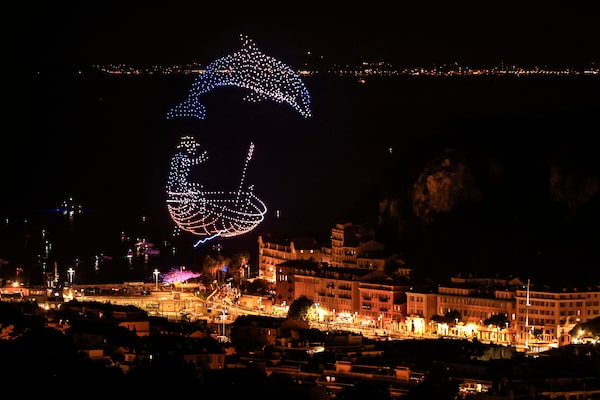 A drone light show celebrates the arrival of the 111th edition of the Tour de France cycling race in Nice, southeastern France, on July 20, 2024.VALERY HACHE/Getty Images