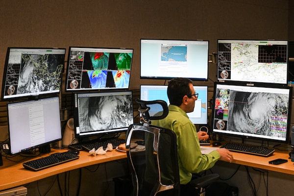 Weather forecaster Andrew Hagen works at his station at the National Oceanic and Atmospheric Administration's National Hurricane Center in Miami, Florida, on May 30.CHANDAN KHANNA/AFP/Getty Images