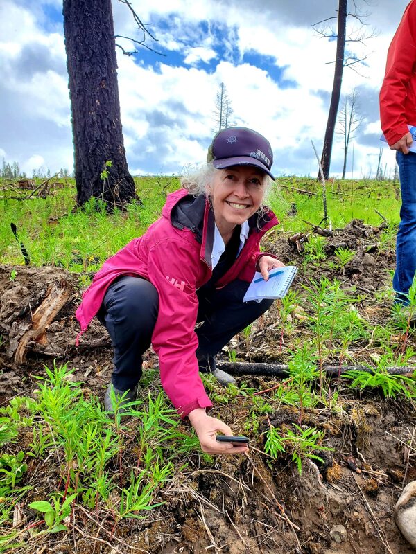 Wendy Stueck in the field near Williams Lake getting really excited over a baby treeAleece Laird, Forest Enhancement Society of British Columbia/Supplied