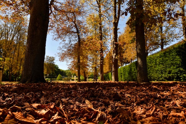 This photograph taken on August 6, 2022, shows leaves that have turned brown and fallen to the ground early, at the Parc de Saint Cloud near Paris as France experiences a heatwave. - France saw its driest July on record, the weather agency said, exacerbating stretched water resources that have forced restrictions.JULIEN DE ROSA/AFP/Getty Images