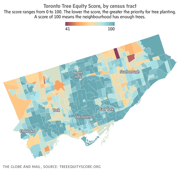 The tool found that Toronto is a city of arboreal haves and have nots: Neighbourhoods with lower incomes and more racialized residents have fewer trees.