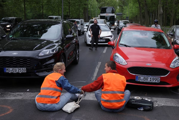 Activists of the Last Generation ("Letzte Generation") climate action group block Puschkinallee avenue on May 23, 2023 in Berlin, Germany. Last Generation activists are now into their fifth week of nearly daily disruptive protests by blocking traffic in Berlin as they seek to put pressure on politicians to enact stronger legislation towards mitigating climate change.SeanGallup/Getty Images