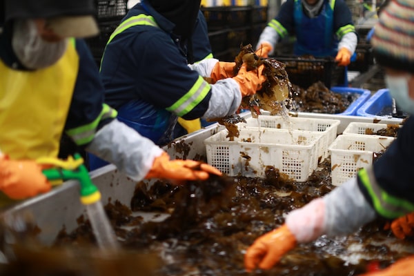 Workers process 1.2 tonnes of sugar kelp at Hub City Fisheries in Nanaimo, B.C., on April 21, 2022.CHAD_HIPOLITO/The Globe and Mail