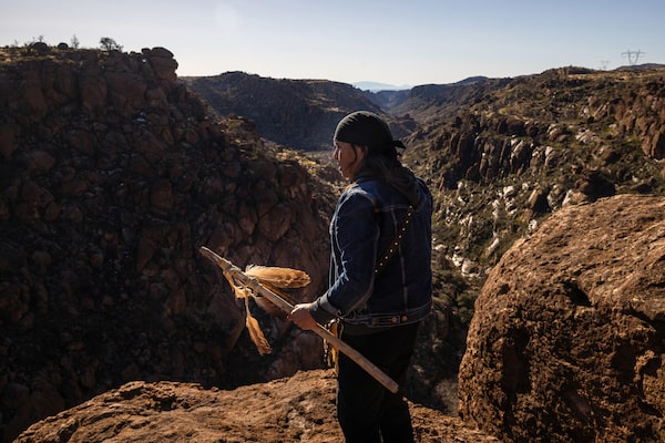 Wendsler Nosie, a former chairman of the San Carlos Apache Tribe, who considers the rolling hills and hidden canyons under which more than 1 billion tons of copper lie, an area known as Oak Flat, to be a corridor to God inhabited by holy spirits, near Superior, Ariz, Jan. 21, 2023. Tribal groups in Arizona are fighting a copper-mine project, which they say would scar their sacred land, but that proponents say would increase the supply of a metal crucial to batteries and reduce fossil-fuel use.TAMIR KALIFA/The New York Times News Service