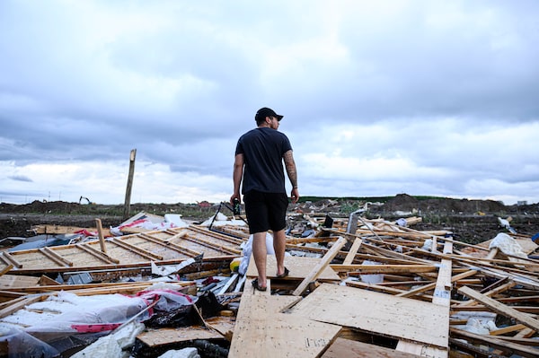 A resident surveys the damage left after a tornado touched down in his neighbourhood, in Barrie, Ont., on July 15, 2021.Christopher Katsarov/The Canadian Press