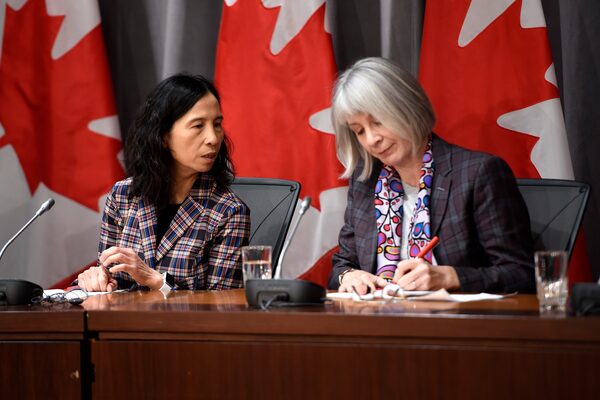 Chief Public Health Officer of Canada Dr. Theresa Tam speaks with Minister of Health Patty Hajdu during a press conference on COVID-19 in West Block on Parliament Hill in Ottawa, on Friday, March 20, 2020.Justin Tang/The Canadian Press