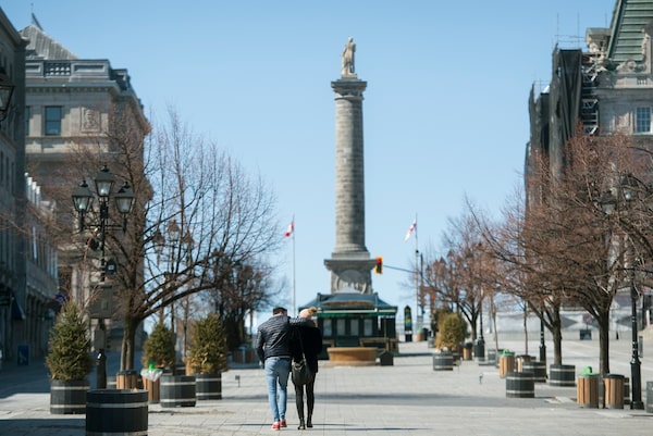 A man and woman walk along what is a normally a busy Place Jacques-Cartier in Montreal's Old town, Saturday, March 21, 2020, as COVID-19 cases rise in Canada and around the world.Graham Hughes/The Canadian Press