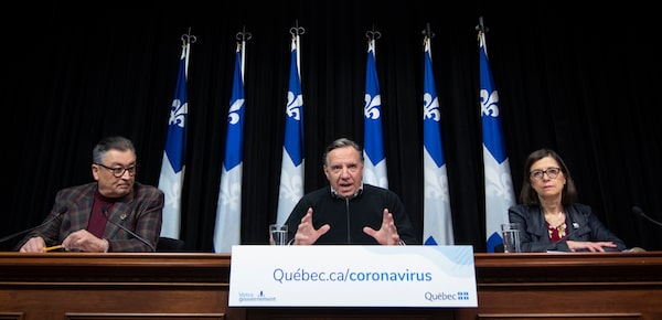Quebec Premier Francois Legault, flanked by Horacio Arruda, Quebec director of National Public Health, left, and Quebec Health Minister Danielle McCann, responds to reporters questions at his daily news conference on the COVID-19 pandemic, Saturday, March 21, 2020 at the legislature in Quebec City.Jacques Boissinot/The Canadian Press