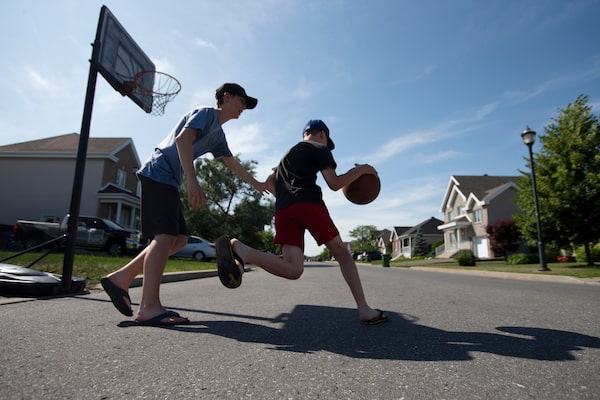Marc-Antoine Brisson and his brother Maxim play basketball on their street in Beloeil, Quebec, on Monday.Christinne Muschi