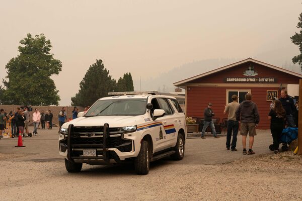 An RCMP vehicle arrives as community members gather to bring supplies onto boats to move across Shuswap Lake while the Bush Creek East fire burns on Aug. 21, 2023.PAIGE TAYLOR WHITE/AFP/Getty Images