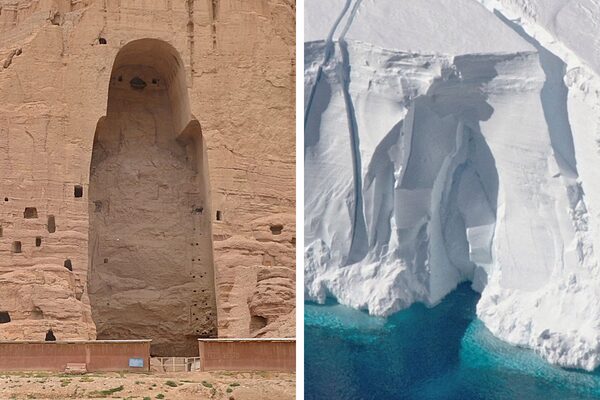 Some vistas get destroyed by human conflict, such as the Buddha statues demolished by the Taliban in Bamiyan, Afghanistan; others are altered by climate change, such as the Getz Ice Shelf in Antarctica, shown cracking in 2016.Reuters, AFP/Getty Images