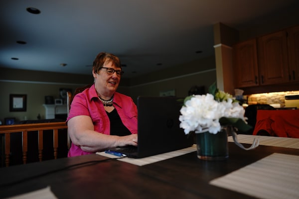 Marlene Bryenton looks at her Facebook messages in her home in Charlottetown, Prince Edward Island Aug. 18, 2023.John Morris/The Globe and Mail