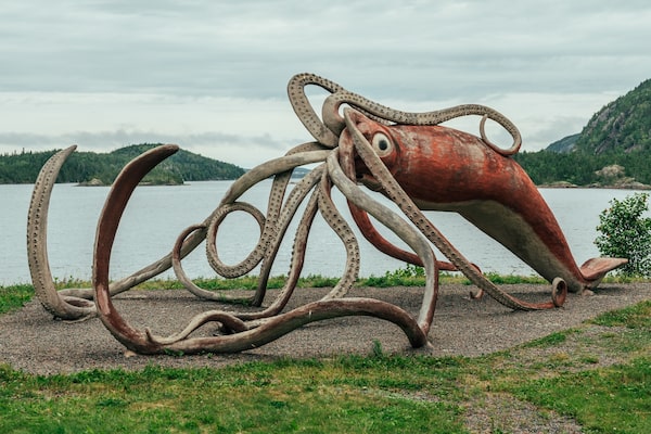 A life-sized replica of the 55-foot long giant squid, designed by Canadian artist Don Foulds that took five months to complete, is now a permanent fixture at the Giant Squid Interpretation Site at GLover's Harbor, Newfoundland on August 14, 2023.Johnny C.Y. Lam/The Globe and Mail