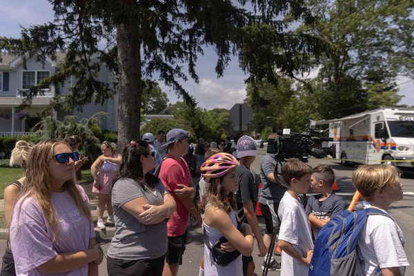 Residents look on as police officers search the home of Rex Heuermann on July 15, 2023, in Massapequa Park, N.Y.Jeenah Moom/The Associated Press