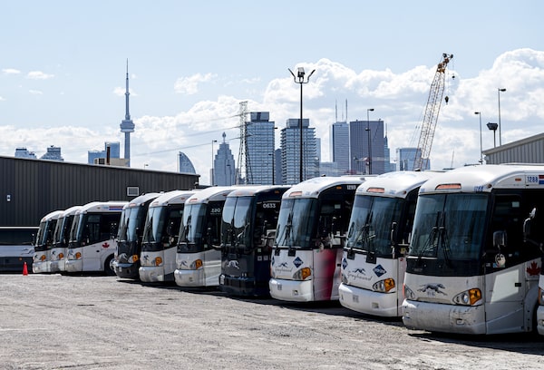 Buses at the Greyhound Maintenance Station in Toronto on May 13, 2021.Christopher Katsarov/The Globe and Mail