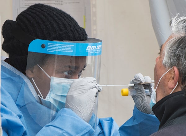 A health-care worker prepares to swab a man at a walk-in COVID-19 test clinic in Montreal North, on May 10, 2020.Graham Hughes/The Canadian Press