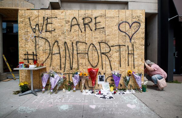 Toronto, July 24, 2018: A woman writes a message on a makeshift memorial remembering the victims of the Danforth shooting.Mark Blinch/The Canadian Press/The Canadian Press