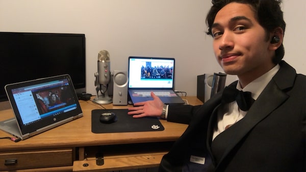 Dean McCarthy wore a sweatshirt to Student Life Network's Virtual Prom is On party, but suits up here for a virtual choir performance for grads and other students, at Holy Heart of Mary High School in St John’s, Newfoundland.Dean McCarthy