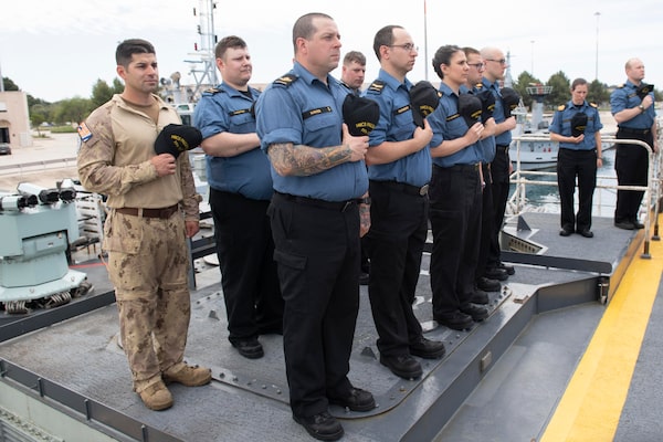 This ship's company from HMCS Fredericton participate in a dignified disembarkation ceremony for their fallen comrades in Taranto, Italy, Sunday May 3, 2020.Cpl. Simon Arcand/The Canadian Press