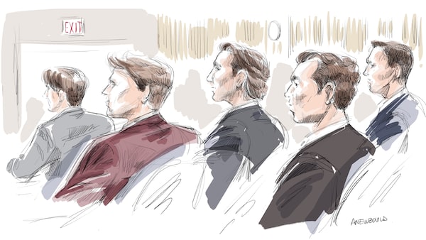 Michael McLeod, Carter Hart, Alex Formenton, Dillon Dubé, Callan Foote, shown in court in this courtroom sketch, were all found not guilty.Alexandra Newbould/The Canadian Press