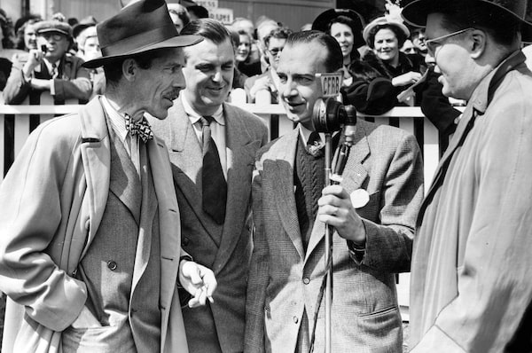Doug MacFarlane, right, helps out with radio play-by-play of the King's Plate in 1948 with fellow journalists from The Globe and CFRB.John Boyd/The Globe and Mail
