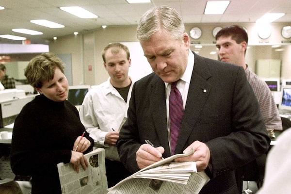 Conrad Black autographs copies of the National Post for staff on Oct. 27, 1998, the day of the newspaper's first edition.Andy Clark/Reuters