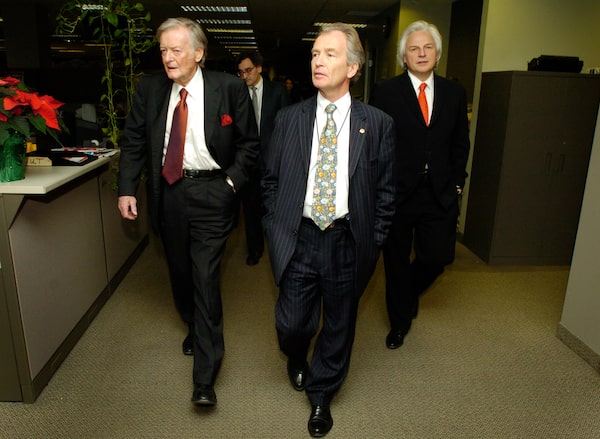 Woodbridge chairman Kenneth Thomson, Globe and Mail publisher Phillip Crawley and Bell GlobeMedia CEO Ivan Fecan walk through the Globe newsroom in 2005.Kevin Van Paassen/The Globe and Mail