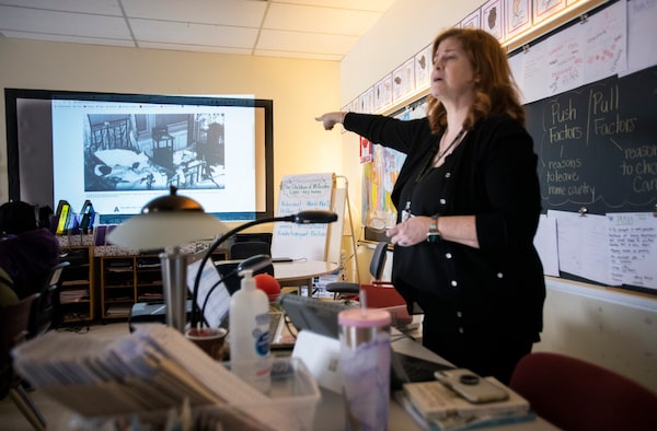 Grade six teacher Cindy Kozierok shows students at Rockford Public School images from events preceding the Holocaust, during a social studies class on Jan 23.Fred Lum/The Globe and Mail