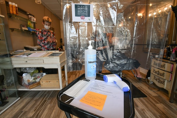 A COVID-19 screening station in a salon in Windsor, Ont., on June 25, 2020.Rob Gurdebeke/The Canadian Press