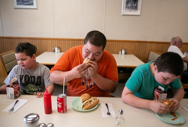 Jake MacLaurin, middle, bites into a Coney dog at Coney Island Westfort in Thunder Bay. Jake, a member of the nearby Fort William First Nation, often comes to the diner with his sons Odin, 7, left, and Donald, 10.Photography by Melissa Tait/The Globe and Mail